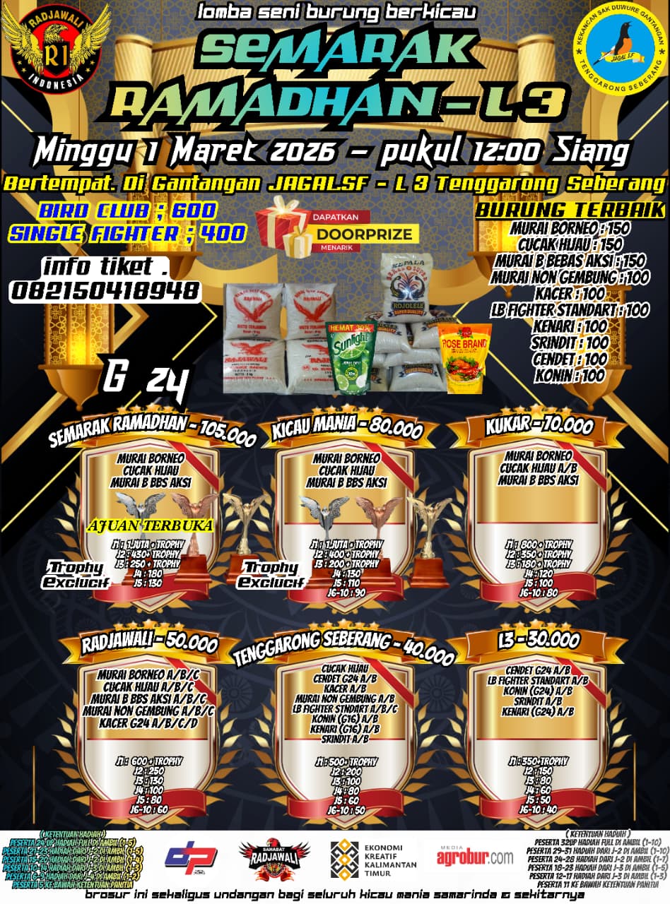 Memasuki awal Ramadhan 1447 H, punggawa Radjawali indonesia pimpinan Afandhy memainkan agendanya di Gantangan RI Triple A Palaran Samarinda bertema Latpres Minggu Ramadhan (22/02/2026). Lomba yang sejatinya dimulai sejak siang hari tersebut akhirnya harus mundur dari jadwal karena sebagian besar Kicau Mania baru penyesuaian di bulan puasa.