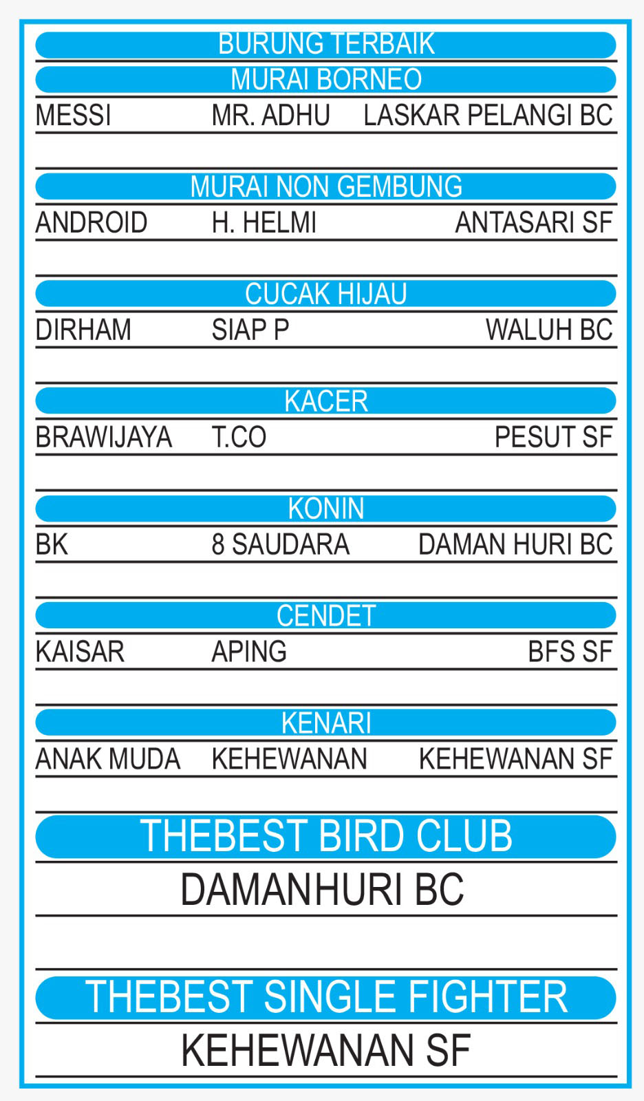 Pada jalannya lomba bertempo sedang tersebut Kicau Mania juga menikmati dengan happy tidak ada teriakan ataupun  protesan berlebihan, hanya sebatas pertanyaan dari peserta kurangnya gacoannya. Akhirnya Damanhuri BC yang dikomando oleh Dasir, Mbah Hasta punggawa KNS SF mampu keluar sebagai juara Bird Club meninggalkan kejaran tim lainnya.