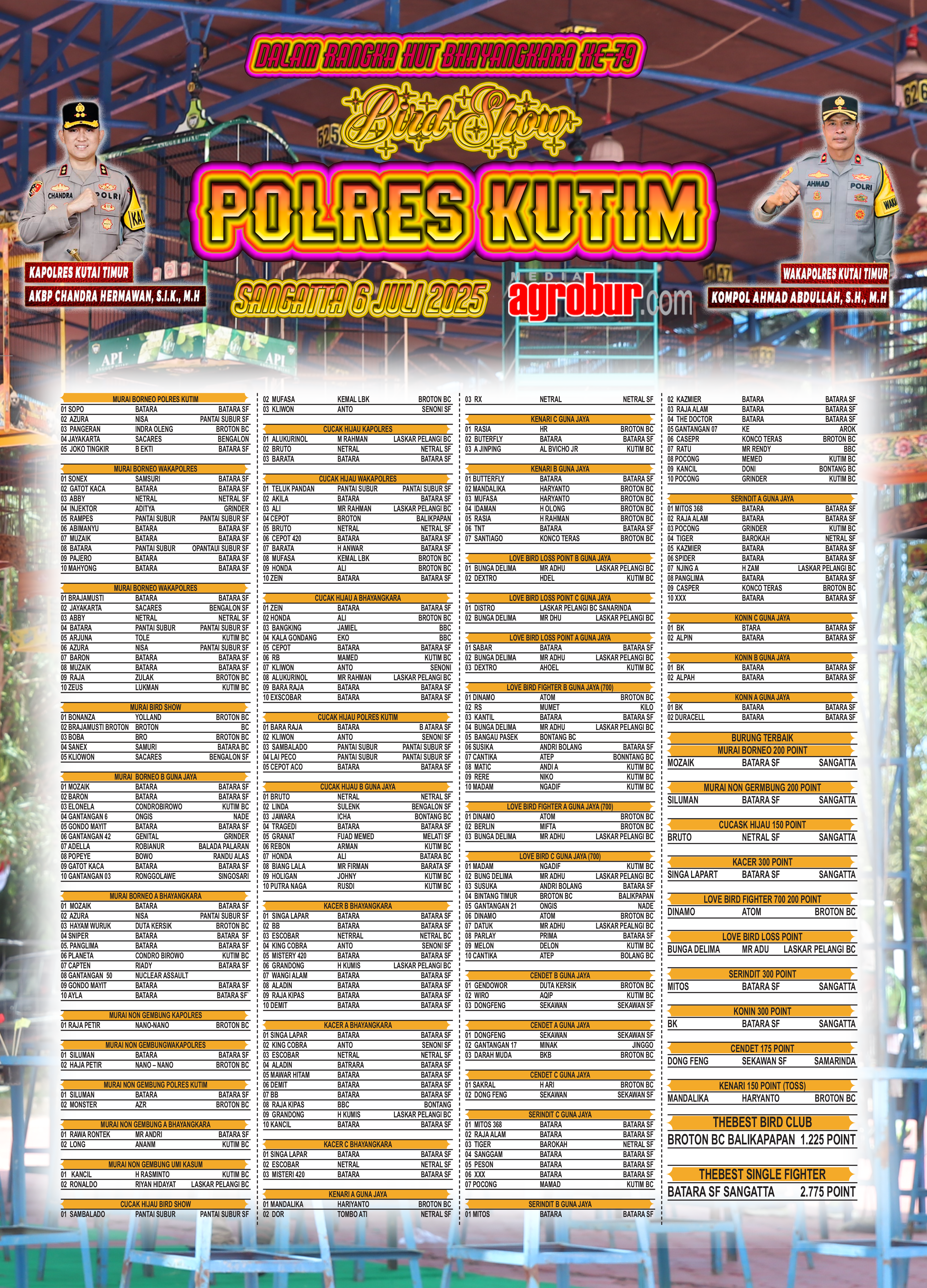 Dalam jalannya lomba Broton BC Balikpapan yang hadir dengan kawalan langsung Bro Tony Maestro Kicau Mania Kaltim yang sedang mengkilap prestasinya di Nusantara semakin terlihat perkasa sebagai Juara Umum Bird Club 1.225 Point.