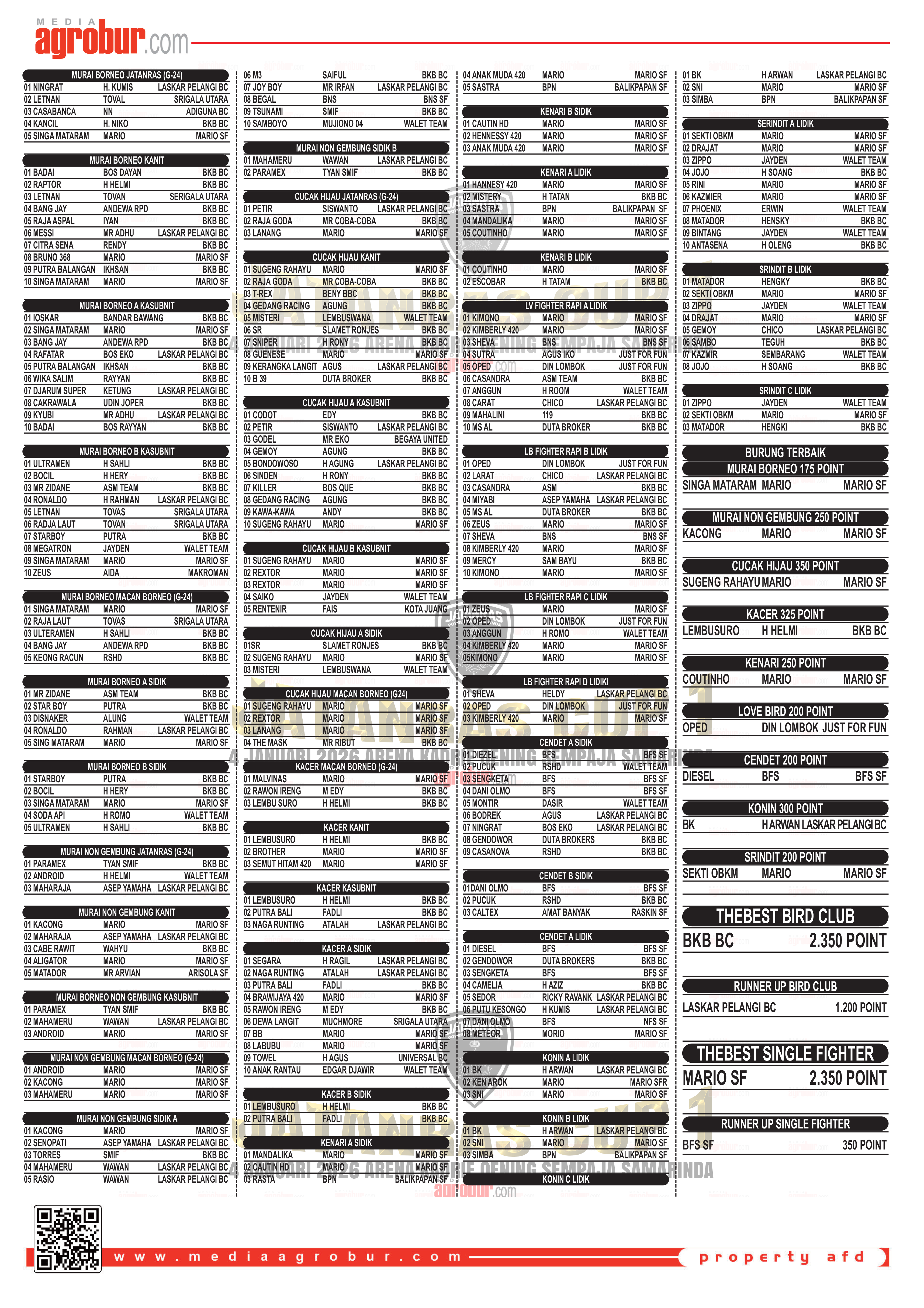 Ketua Pelaksana Kriswanto yang juga sebagai penghobi burung legendaries Murai Borneo Sengketa sangat mengakui kalau burung yang diturunkan siang itu semua bagus – bagus. “Betul sekali burung yang turun siang itu sangat bagus – bagus bahkan 44 Kelas lomba yang ditawarkan panitia rata – rata Full gantangan. Jadi sudah tepat panitia menggulirkan guncangan untuk nama Juri yang bertugas per Seasionnya untuk menghindari titipan juga menambah rasa Fair Play dilapangan lomba,” ungkapnya.