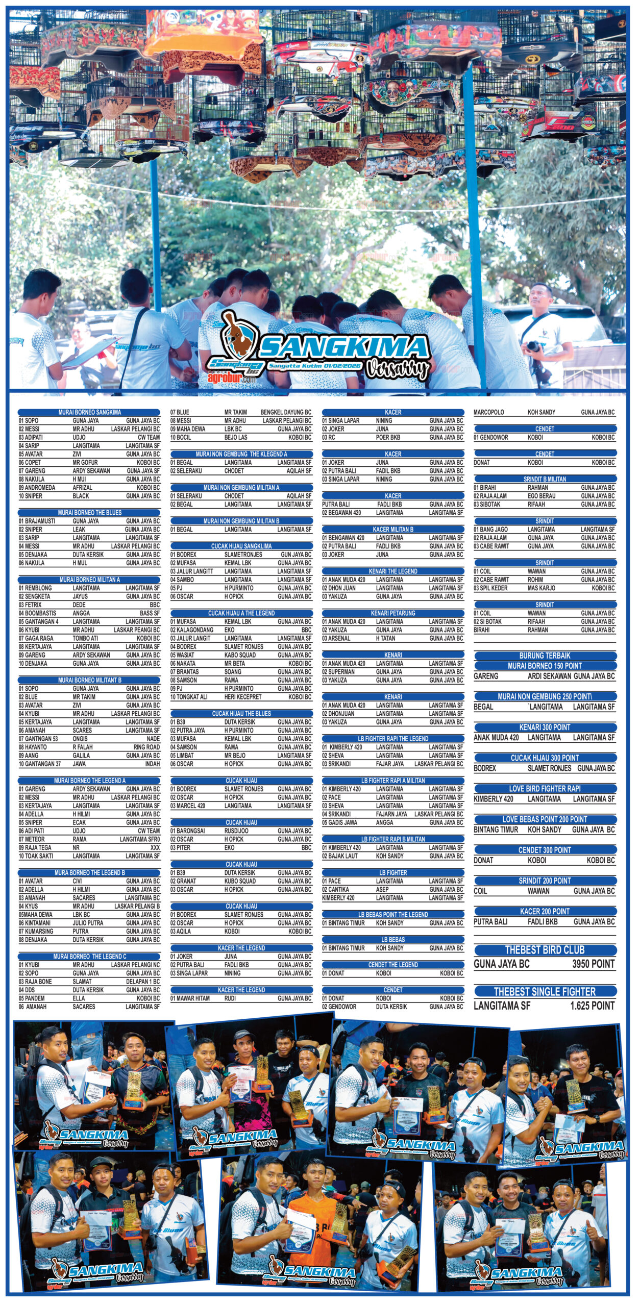 Lomba bertempo sedang itu memunculkan banyak jawara dari berbagai blok sehingga bisa dipastikan bahwa persaingan siang itu sangat merata dan kompetitif. Guna Jaya BC Sangatta pimpinan Koh Sandy dan Boby Mercy dengan dukungan yang sangat Masif dari hampir 80 persen Kicau Mania dari Balikpapan, Samarinda, Bontang, Sangatta, Bengalon dan lainnya seakan tak terkejar lagi dengan mengumpulkan 3950 Point akhir sangat melambung tinggi. Dengan kemenangan ini bisa dipastikan Guna Jaya BC bisa dibilang adalah juara bertahan Sangkima Versarry, namun yang membedakan pada edisi sebelumnya Sangkima Versarry 2024 lalu Guna Jaya bermain Single Fighter.